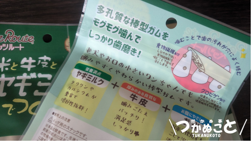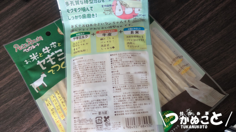 製造元は「株式会社ペッツルート」本社は大阪にあるようです、いちよう国産と書いてありましたの信用するしかないですね書いてあるんだからねぇ~、原材料は「牛皮、米粉、食物繊維、タピオカ加工でん粉、還元水飴、山羊乳(脱脂) 他」と書いてありましたので詳しくは下記より・・・。