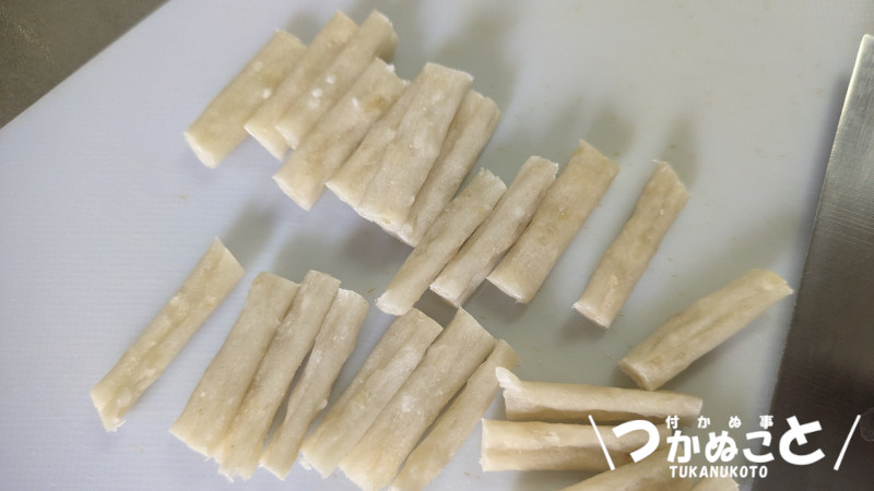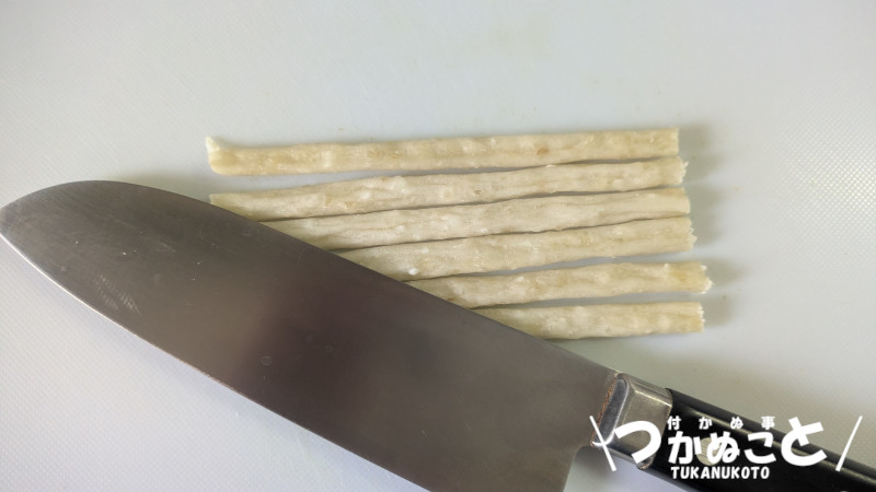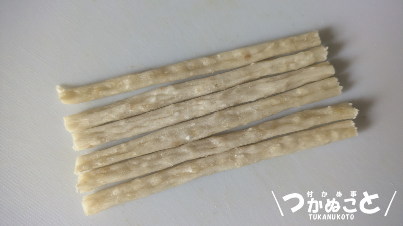 「お米と牛皮とヤギミルクでつくったガム」開封すると1本約13センチほどの「ガム」です、けっこう柔らかいのですが(手でちぎれるほど)実際に包丁で切るのはチョット大変です、調理用のはさみも使って切ってます。