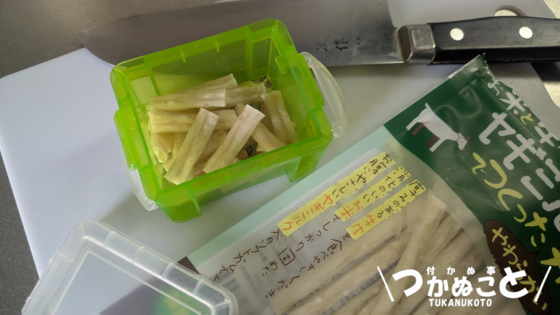 切り終わったらフタ付きのタッパー等に乾燥材と一緒に入れて保存です、しつけ用にもう少し小さくしても良いかもしれませんねぇ~。