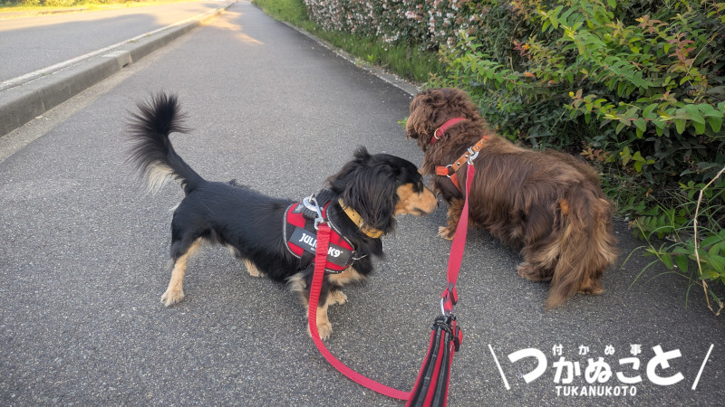通勤通学の自転車やクルマ等「びすけっと」「もなか」は、臆病なので吠えまくったりビビりまくったりするのでおさんぽ中は余計なところに力が入って疲れちゃいますからねぇ~